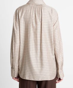 Traditional fabrics and patterns underpin our Fall Collection. This lightweight button-up is finished with a timeless micro check in a versatile mix of neutrals. Smocked ruching adds soft volume to the nape and cuffs.